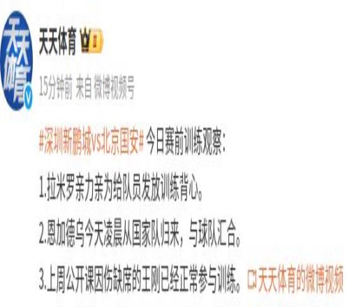 社媒原文:“今日赛前训练观察:1.拉米罗亲力亲为给队员发放训练背心。2.恩加德乌今天凌晨从国家队归来,与球队会合。3.上周公开课因伤缺席的王刚已经正常参与训练。”